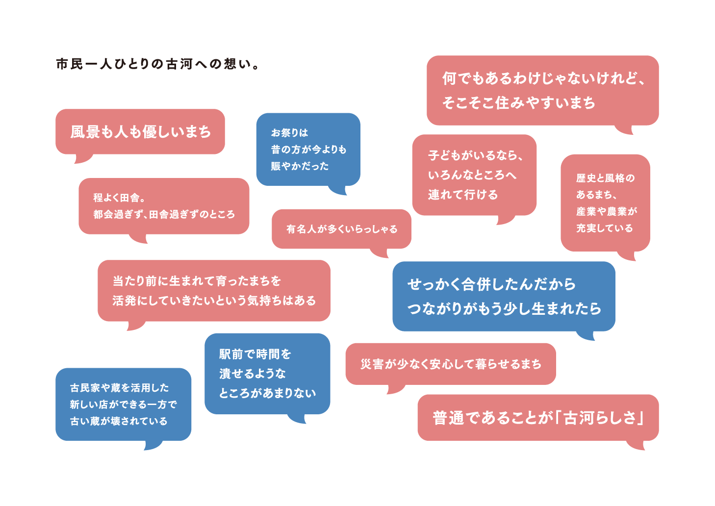ブランド戦略「こがくらす」がなぜ必要なのか、古河市の価値を高めていくためになにをしていこうとしているのか、小冊子にまとめています。 市民の皆さんが古河の魅力をあらためて考えるサポートになるようにつくりました。 ぜひダウンロードしてご活用ください。