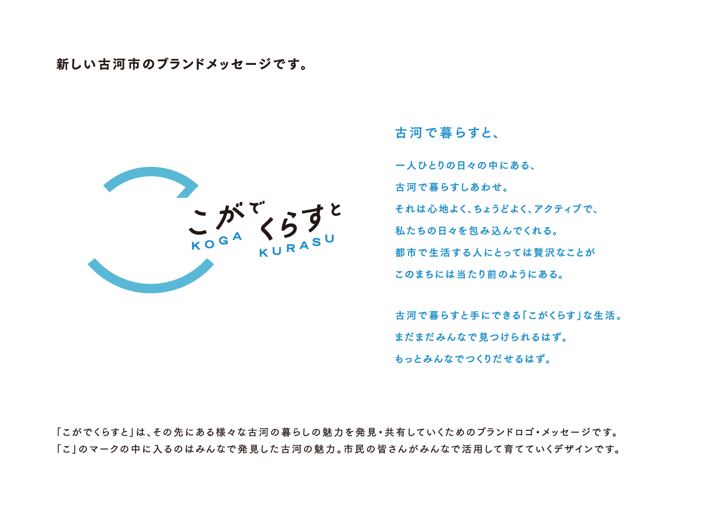 あなたなら「こがでくらすと」の続きはなんと答えますか。それは言葉だったり、モノだったり、風景だったりするかもしれません。目指すのはみんなの「こがでくらすと」が集まって、他のまちにはない魅力にあふれたブランドになっていくこと。マークの「こ」の中に、あなたならどんな古河の暮らしの魅力を入れますか。