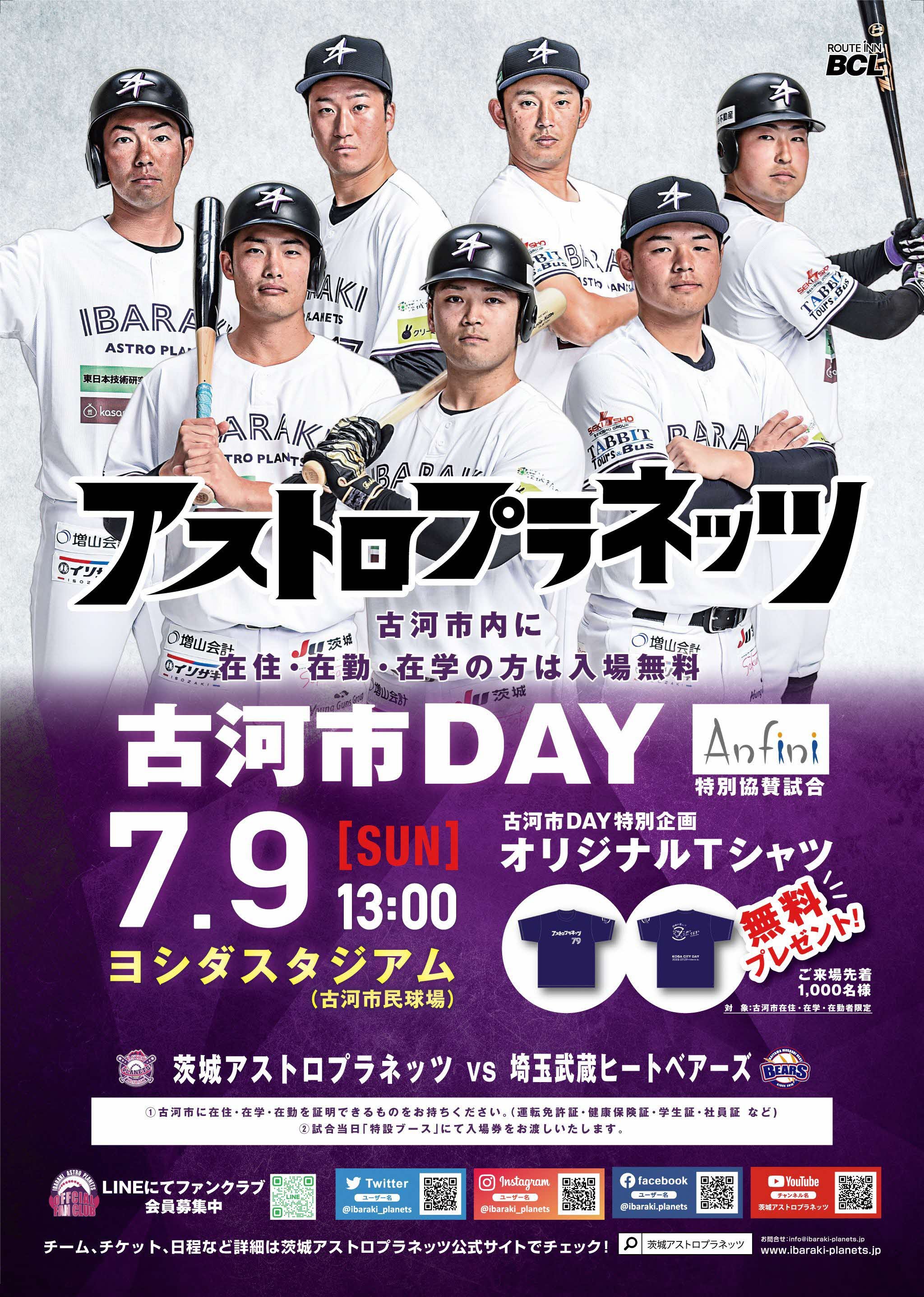 古河市にお住まいの方、古河市内に在勤・在学の方は入場無料の「茨城アストロプラネッツ 古河市DAY」を7月9日(日)に開催します。 ルートインBCリーグ2023公式戦のほか、アストロプラネッツの選手たちと交流ができる様々なイベントを予定しています。